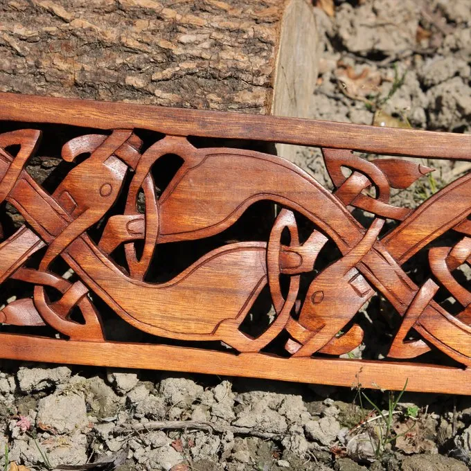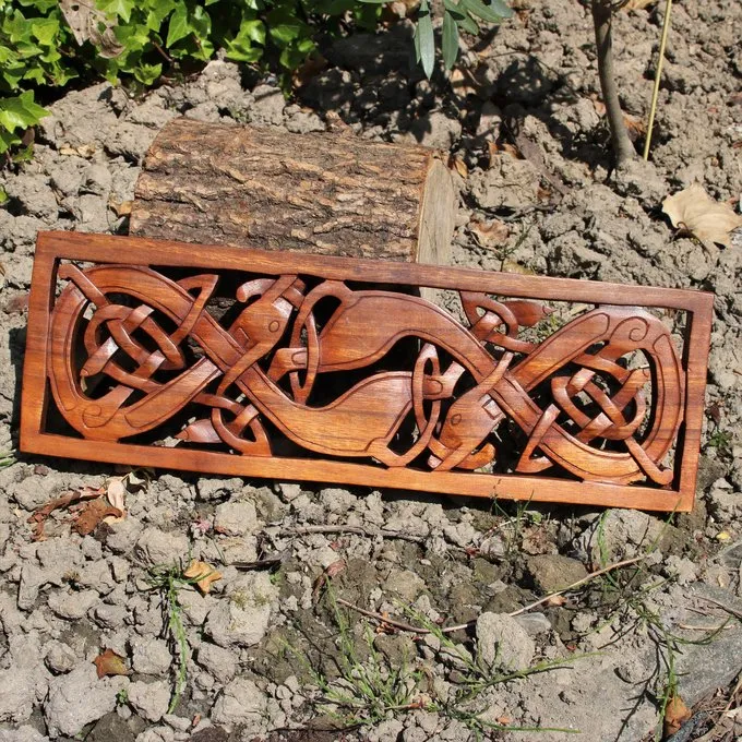 Dieses Holzschnitzwerk wird nach einem Folio im Buch von Kells gemacht. Das Buch wurde im 8. bis 9. Jahrhundert auf der schottischen Insel Iona gemacht. Bedroht von den Viking Invasionen, wurde das Buch zu Kells in Irland gebracht.