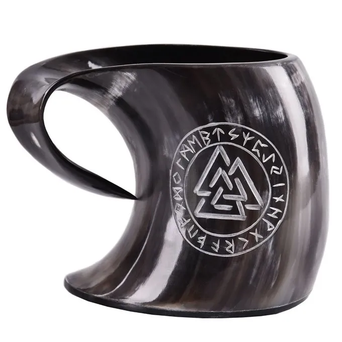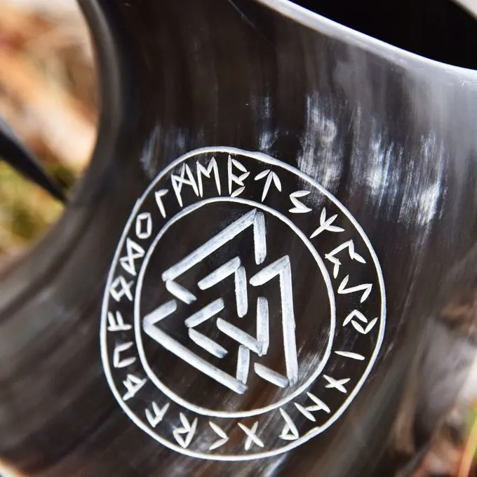 Dieser schöne Hornbecher ist handgefertigt aus Büffelhorn, poliert und graviert. Das Innere ist mit einem Lack versehen, sodass Sie kalte Getränke davon trinken können. Verwenden Sie diese Tasse für LARP, Festivals oder genießen Sie Ihr Lieblingsgetränk zu Hause. Es ist auch ein wunderschönes Dekorationsstück und sehr schön als Geschenk zu geben. Die Tasse ist mit einem Valknuss eingraviert. Dieses Motiv besteht aus drei Dreiecken und erscheint auf einer Reihe von Objekten germanischer Völker. Seine Bedeutung ist nicht sicher, aber es wird angenommen, dass es Odin symbolisiert. Heute ist es ein beliebtes Symbol für Heidentum und Asatru.