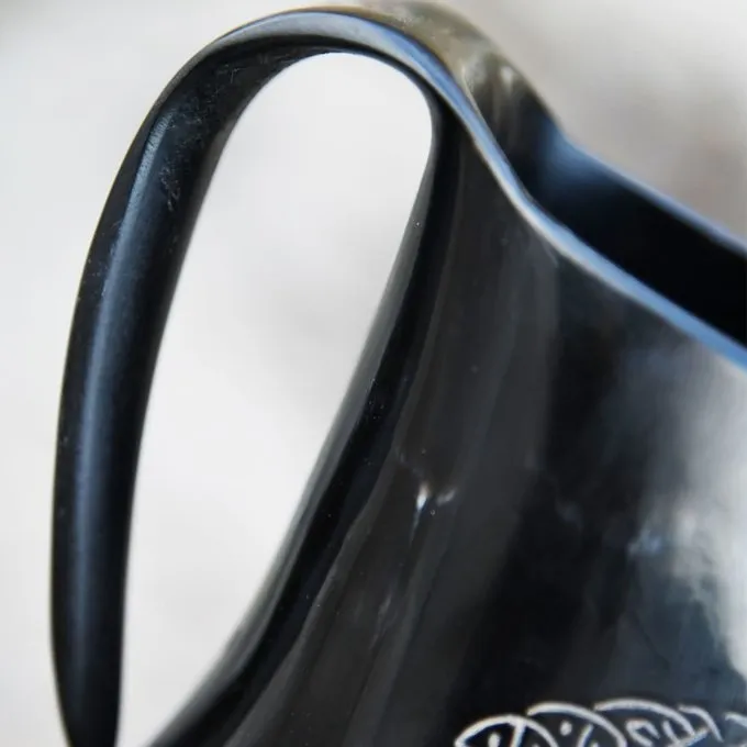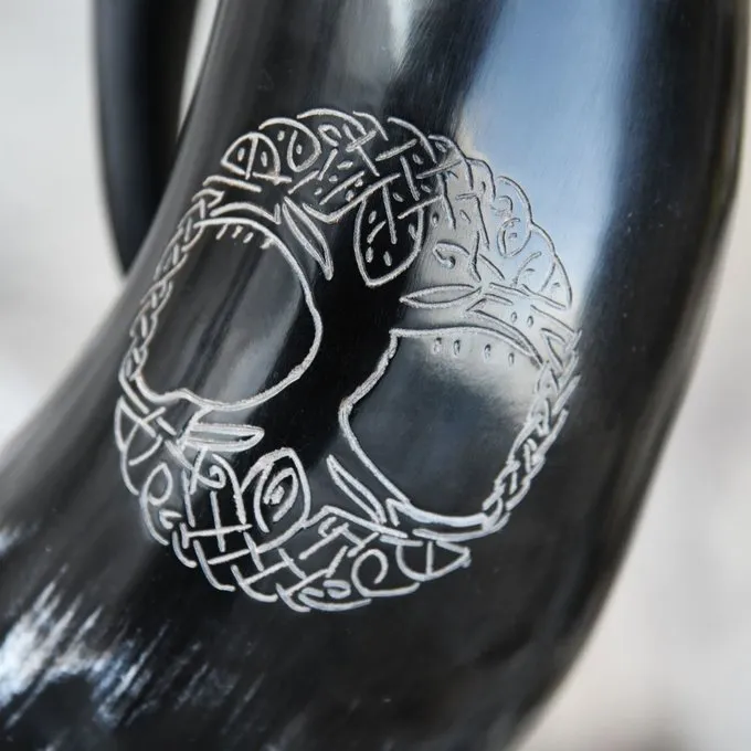 Dieser schöne Hornbecher ist handgefertigt aus Büffelhorn, poliert und graviert. Das Innere ist mit einem Lack versehen, sodass Sie kalte Getränke davon trinken können. Verwenden Sie diese Tasse für LARP, Festivals oder genießen Sie Ihr Lieblingsgetränk zu Hause. Es ist auch ein wunderschönes Dekorationsstück und sehr schön als Geschenk zu geben. Die Tasse ist mit Yggdrasil, dem Baum des Lebens in der nordischen Mythologie, eingraviert. Yggdrasil ist immergrün und verbindet die Erde, den Himmel und die Unterwelt. Es ist ein heiliger Baum und symbolisiert Wissen, Leben, Unsterblichkeit. Ein beliebtes Symbol im Heidentum.