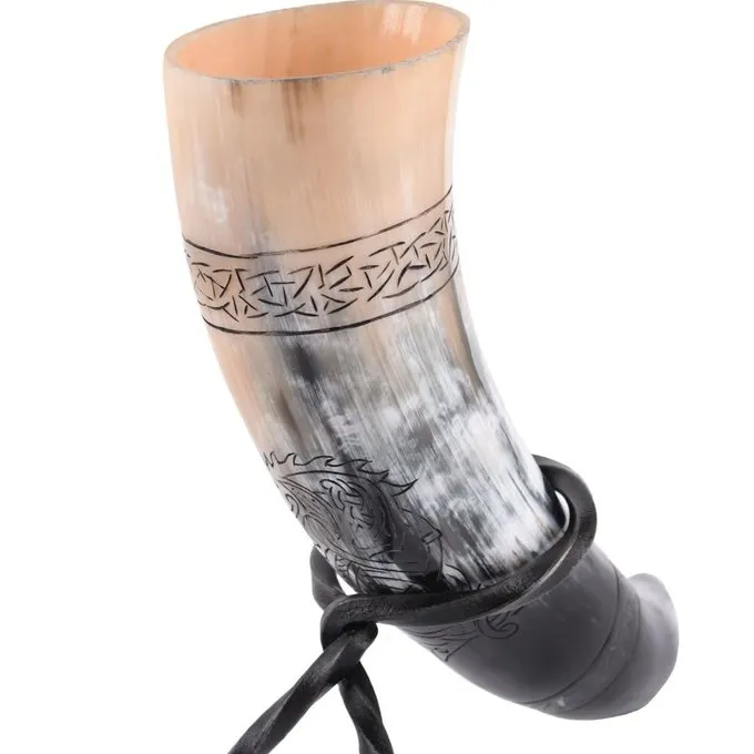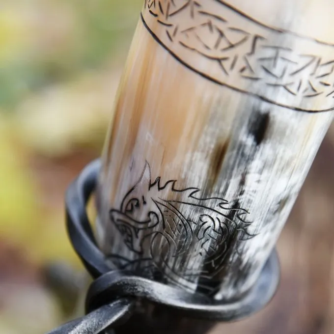 Im Laufe der Jahrhunderte wurde das Trinkhorn bei Zeremonien und Feierlichkeiten von verschiedenen Völkern als Tasse genutzt. Die Verwendung des Trinkhorns wird sogar in der EDDA erwähnt. Dieses Horn ist perfekt für die Nachstellung von Wikinger, Wohnkultur, LARP und macht ein wunderbares Geschenk. Es ist auch ideal für Festivals. Dieses Trinkhorn wird aus Büffelhorn aus handgemacht und poliert. Der Innenraum ist lackiert. Kannst du aus ihm trinken? Es kommt mit einem Metallständer, mit dem Sie ihn auf den Tisch legen können. Das Horn ist mit dem Wolf Fenrir eingraviert. In der nordischen Mythologie ist dies der Sohn von Loki und der Riesen Angrboda. Er kämpft gegen die Weltordnung und bringt schließlich das Ende der Welt, Ragnarok. Er ist am Meeresgrund gekettet, bis er schließlich Odin verschlingen und die Welt zerstören wird.