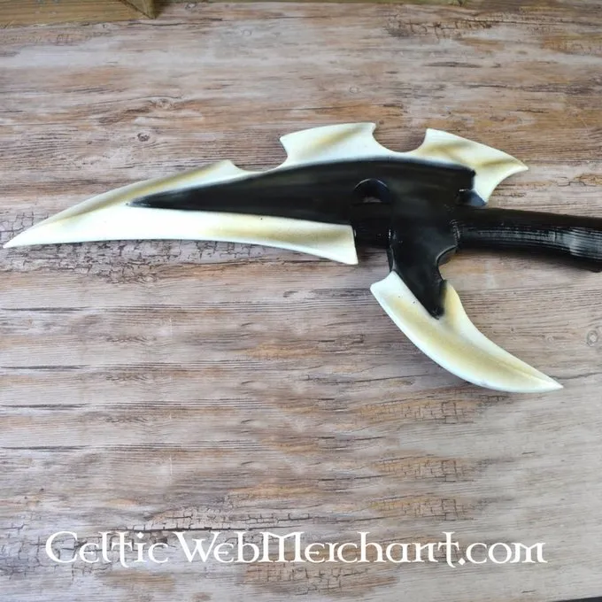 Dunkelelfen Krieg Axt. Diese LARP Axt ist 100 cm lang, die Axt Kopf beträgt ca. 32 cm lang und 55 cm hoch, wiegt 345 g. Die Axt hat einen flexible Glasfaser-Kern mit einer Schicht aus strapazierfähigem Schaumstoff, mit einer starken Schicht aus Latex beschichtet. Die Axt ist handgefertigt und von Hand gefärbt, so jedes Element einzigartig ist. Aufgrund des Materials empfehlen wir nicht die Axt in der Sonne für längere Zeit verlassen. Die Dunkelelfen Krieg Axt von Epic Armoury erfüllt hohe Sicherheitsstandards