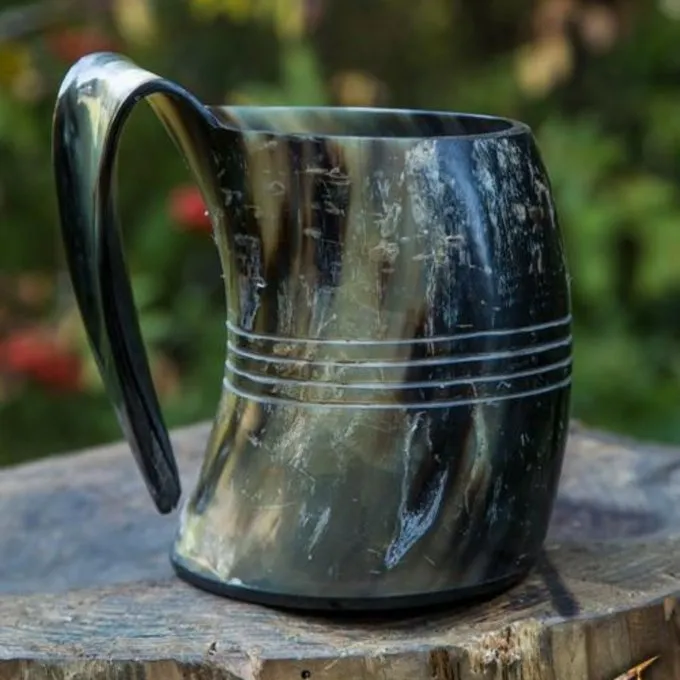 Handgemachte Horn Trinkbecher, wie in verschiedenen Serien verwendet, wie Wikinger, Game of Thrones und The Last Kingdom. Dieser Becher kann bis zu 0,5L Ihrem Lieblingsgetränk enthalten. Der Becher hat einen Handgriff dafür halten. Die Außenseite ist glatt für einen edlen Look poliert und ist wunderschön mit vier gravierten Ringen um die Schale verziert. Die Innenseite ist auch poliert und mit einer Schutzschicht versehen, so daß sie zum Verzehr von Flüssigkeiten geeignet ist. Bitte beachten Sie: sein Becher für warme Flüssigkeiten nicht geeignet ist. Perfekt für Feste, Reenactment, LARP oder einfach nur zum Entspannen zu Hause auf der Couch.