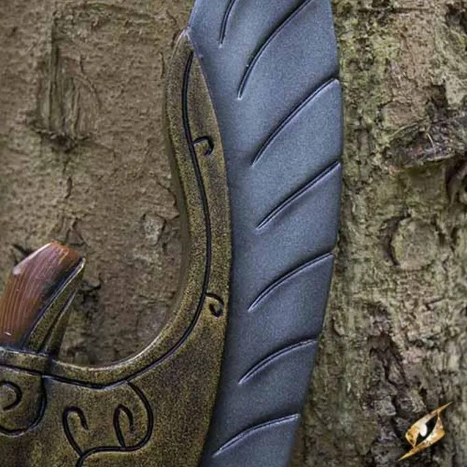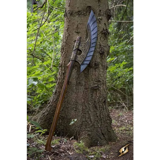 Diese riesige LARP Streitaxt ist 150 cm lang. Es wird gemalt naturgetreue und sieht aus wie es aus Holz, Stahl und Gold gefertigt ist. Das Beil ist sichelförmig und symbolisiert einen elfischen oder Vogelflügel, ist dieser Entwurf deshalb speziell für elfische Charaktere entworfen. Der goldfarbene Teil zeigt eine elegante Dekoration im elfischen Kunstart. Perfekt für Ihre Feinde während LARP Schlachten herausnehmen.