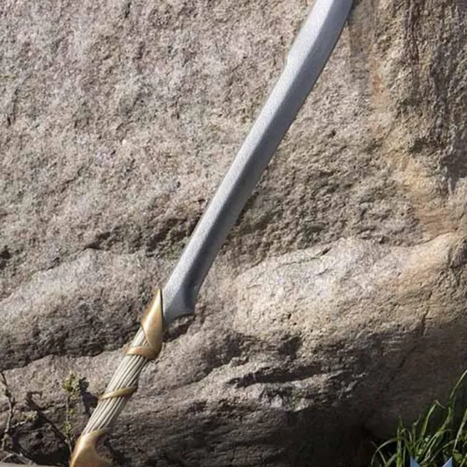 Dieses Elven Jagdmesser wird durch die Märchenwelt inspiriert. Das Schwert ist 75 cm lang und hat eine Klinge mit einer Kurve, die für Wegschneiden von Gefahren perfekt. Die detaillierte Griff hat eine handlackiert, die sich um polierte Asche wie verblasste Gold gehüllt aussieht. Durch die Rippen in dem Griff, rutscht es nicht aus der Hand. Die Klinge ist auch lebensecht bemalt.