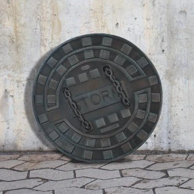 Dieses LARP Schild ist auf dem amerikanischen Kanaldeckel basiert. Dieses Latex Schild gemalt lebensecht erscheint und wurde von Epic Armouries im dunklen Mond-Serie, eine moderne und postapokalyptischen LARP-Serie entworfen. Dieses Schild hat einen Glasfaser-Kern mit Kevlar bedeckt. Die Haut besteht aus Schaumstoff.