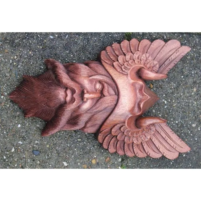 Diese Wanddekoration zeigt den nordischen oberen Gott in all seiner Pracht. Er hat einen langen Bart und einen Schnurrbart, und er trägt einen Helm. Diese Holzschnitzwerk wird komplett von Hand gefertigt und misst 40 x 25 cm.