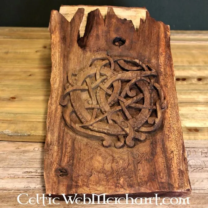 Midgard Schlange Wanddekoration. Nach Angaben der Viking Legende war diese Schlange so groß, dass sein Körper die Welt umkreisen könnte. Er misst ca.. 40 x 23 x 3,5 cm und ist aus steigen Holz. Die Midgard Schlange ist eine von Lokis Kinder.