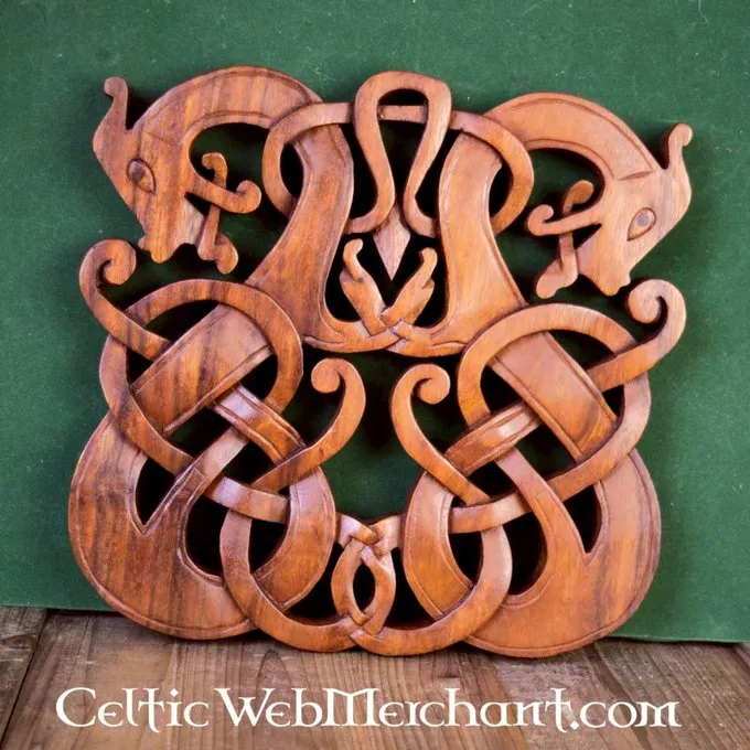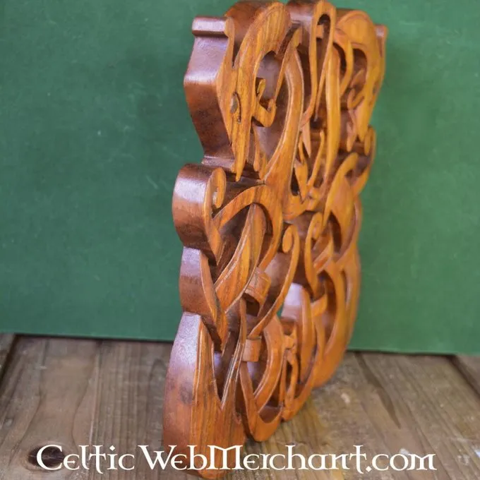 Zwei Viking Drachen nach rechts und links schauen, gefangen in einem Jellinge Stil Knoten Motiv. Diese handgeschnitzte Holzschnitt misst ca.. 28 x 27 cm.