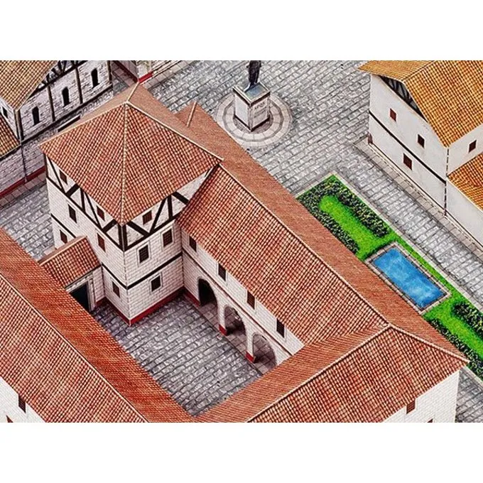 Dieses Modell Bausatz nach römischen Stadtpläne aus dem 1. und 2. Jahrhundert hergestellt. Das Kit hat einen durchschnittlichen Schwierigkeitsgrad und wird von A3 Karton hergestellt. Das römische Stadtmodell beträgt ca. 42 cm lang und auf einer Skala von 1:87 hergestellt. Römische Städte haben eine einheitliche Stadtplan als Ergebnis Römer aus anderen Städten leicht umgehen könnten. Die Stadt könnte auch leicht in Zeiten des Krieges verteidigt werden. In der Mitte der Modellstadt steht eine Bronzestatue: vielleicht einen Senator oder Politiker aus der Region. Die Straßen sind gefliest mit langen Fliesen, typisch römischen, mit hohen Gehsteigen. Das Zentrum verfügt über einen Tempel und das Gebäude neben es mehrere Geschäfte mit den typischen römischen Zählern hat. Die Straße hat zwei schöner Villen, beide mit einem großen Garten im Innenhof (Atrium) und ein Teich. Mit diesem Baukasten können Sie auch im Innern des Gebäudes aussehen!