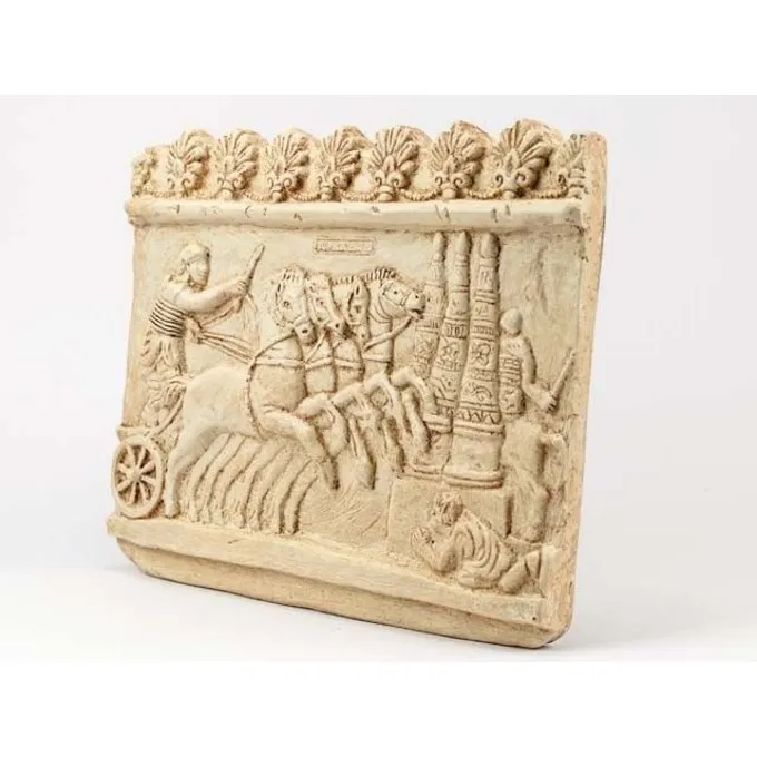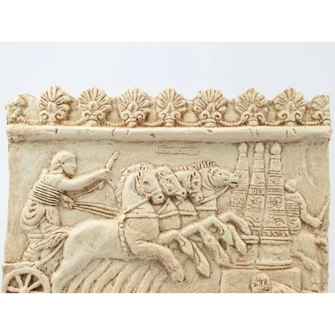 Ein Relica einer Befreiung von dem Circus Maximus in Rom. Dieses sehr detaillierte Relief zeigt einen Wagenlenker mit seinen Pferden. Der Wagenlenker, die oft in der römischen figurativen Kunst erschien, trägt einen typischen Helm. Charioteers als Helden geehrt wurden, können sie mit dem Fußball und andere Sportspieler in der modernen Zeit verglichen werden.