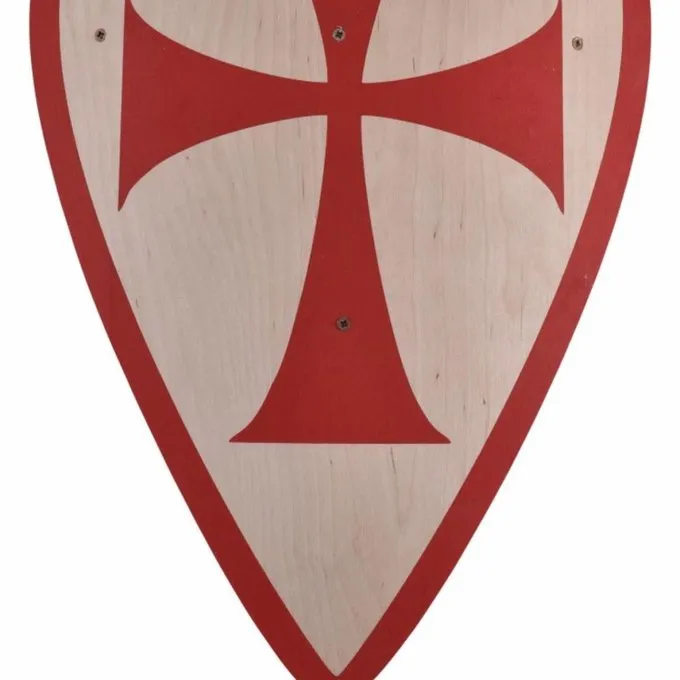 Dieses Schild ist (auf einem weißen Hintergrund rot) mit einem Tempelritter gestaltet. Es hat Schneiden rot. Die Rückseite des Schild hat einen Holzstiel um es zu halten.